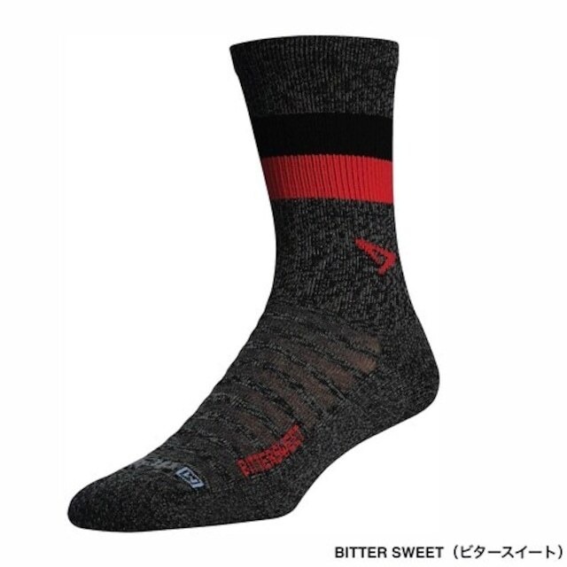 HISTORY トレイルを這いずり回って身体中ドロドロ。 しかし、それは自由への証だ! 身軽にウィルダネスを駆け抜け、 次の街を目指せ! ロング・ディスタンス・トレイルで汚れきったハイカー達はまるでゴミのよう。 そんな彼らはハイカートラッシュと呼ばれいる。 でも、それは決して蔑称などではない。 大自然を自由に闊歩する彼らへのリスペクトだ。 「ヘイ! ハイカートラッシュ! 調子はどうだい?」 FUNCTION HAVE A HOLE SUITABLE FOR KARABINER HIKER TRASHのソックスの履き口にはカラビナを通すためのホールが設けられている。これはロング・ディスタンス・ハイカーたちが濡れたソックスを乾かすためにナイフで穴をあけてテントやバックパックに吊るす様子から着想を得た。乾いたソックスはいつでもハイカーたちを幸せにする! ※商品にはカラビナは付属されません。商品写真の様にロープへ変更いたしました。 USE WASHABLE MERINO WOOL 洗濯機で洗えるウォッシャブルメリノウールを使用。メリノウールは保温性、吸放湿性に優れ、汗による冷えや外気から体を守ってくれる。また天然の抗菌作用により、匂いの元となる雑菌の繁殖を抑えてくれるので臭くなりにくい快適な素材だ。 EXTREMELY TOUGH 一日中歩き続けるロング・ディスタンス・ハイキングではソックスの耐久性が求められる。 メリノウールをベースにナイロンとポリエステルを一緒に編み立てることでソックスの耐久性を格段に高めた。 ソックスの耐久性をはかる摩耗試験においてNo. HT30001<HIKER TRASH ”HIKE&RUN”>の摩耗試験ではつま先・かかとで約6,500回、約足裏で6,000回という数値を記録している。 ※一般的にカジュアルソックスが約500回~1,000回、スポーツソックスで2,500回から3,000回が合格ラインとされている。 FIELD TEST 2017年にSKETCH(RYOSUKE KAWATO)がアメリカ3大トレイル最難のコンチネンタル・ディバイド・トレイル5,000kmをハイキングする際に、HIKER TRASHのプロトタイプをフィールドテストした。途中破損した箇所を日本にいるメンバーにフィードバックし、改良を加えたものをアメリカへ送った。この繰り返しによって誕生したHIKER TRASHシリーズはハイカーに必要なリアルなタフネスさを実現している。 Material : 80%Wool 9%Nylon 8%Polyester 3%Polyurethane Weight : Size S / 38g size M / 40g Size L / 44g