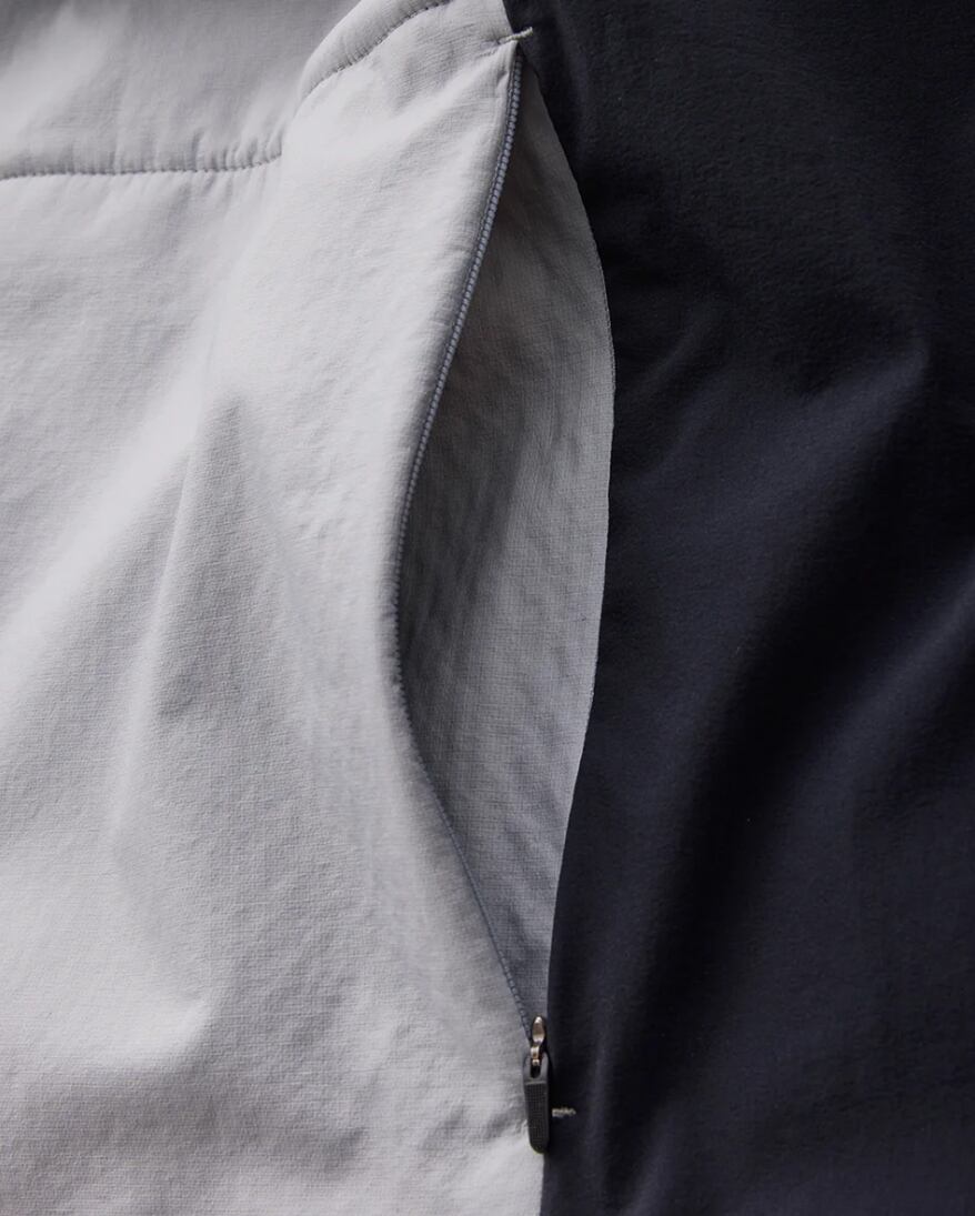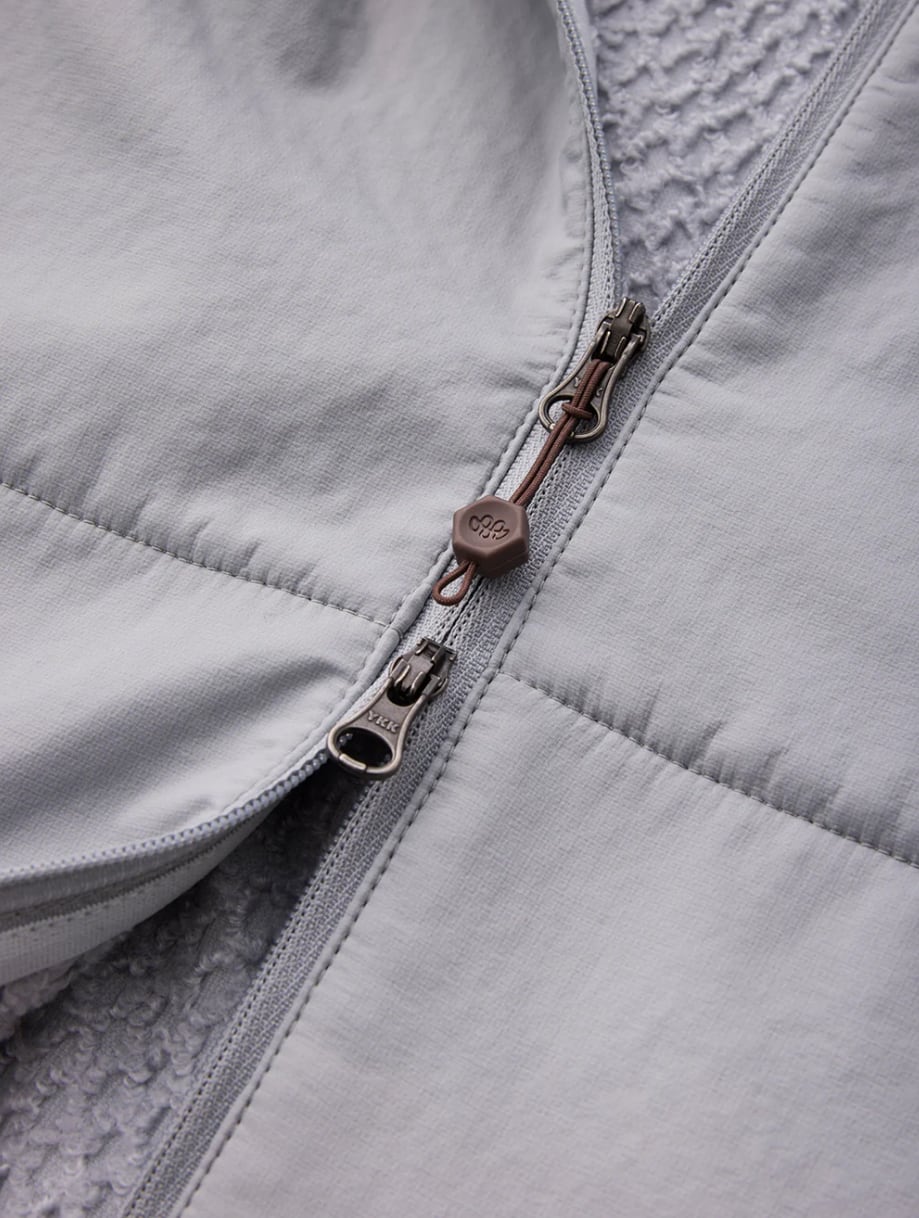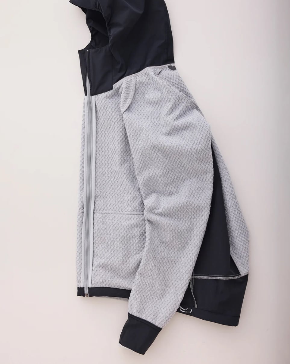 「Stretch Octa Bonding」を全面に使用するSUB JACKET に対して、こちらは保温性が必要な箇所のみにマッピングしました。より運動強度が高いアクティビティや汗をかきやすいユーザーにおすすめの一着です。前身頃と腕の上部、背中の太い筋肉に沿って「Stretch Octa Bonding」を配置。そのほかの部分は通気性とストレッチ性に優れるソフトシェルを使用しています。フードはフィット感を高め、フードの上にヘルメットを被れるようにデザインしています。バックカントリーのミッドレイヤーに留まらず、トレッキングやマウンテンランニングでは単体でも使用可能。動的保温を重視するアクティビティにおいて、通年で幅広く活躍します。