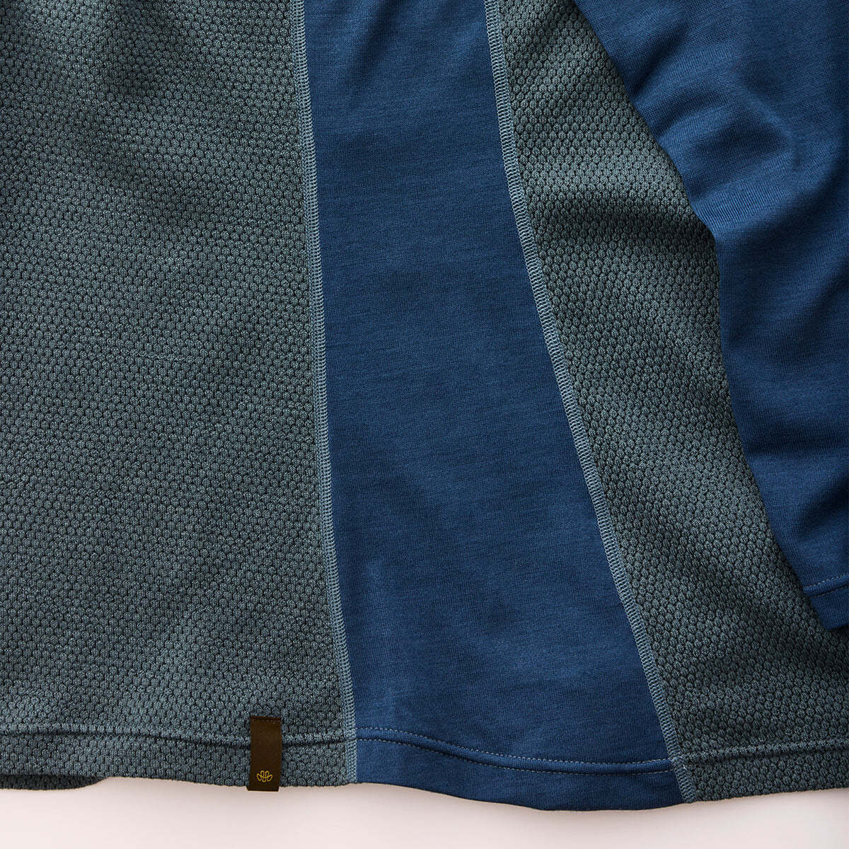 MOB Hybridシリーズのロングスリーブは、体幹部に通気性に優れたMOB Wool、肩・腕・脇に保温性の高いAxio 3Dをハイブリッドマッピング。運動強度の高いアクティビティでも単体使用で快適に保温・クールダウンが可能。肌面は六角形フレーム構造の疎水性ポリプロピレンで速乾性と保温性を向上。シンプルでレイヤリングしやすく、アウトドアから日常まで幅広く活躍する一着。