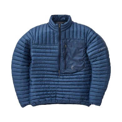 秋冬のダウンジャケットよりも軽量性と携行性を優先し、プルオーバーとしてデザインしました。腹部に硬いジッパーがないぶん、着心地は軽やかで、同時にウェア全体の軽量化につながっています。全体のシルエットはややゆったりめで、さまざまなベースレイヤー、ミッドレイヤーと合わせてもレイヤリングしやすくなっています。夏山シーズンはテントや山小屋での保温着として、冬季は静的保温を重視したミッドレイヤーとしても活躍します。
