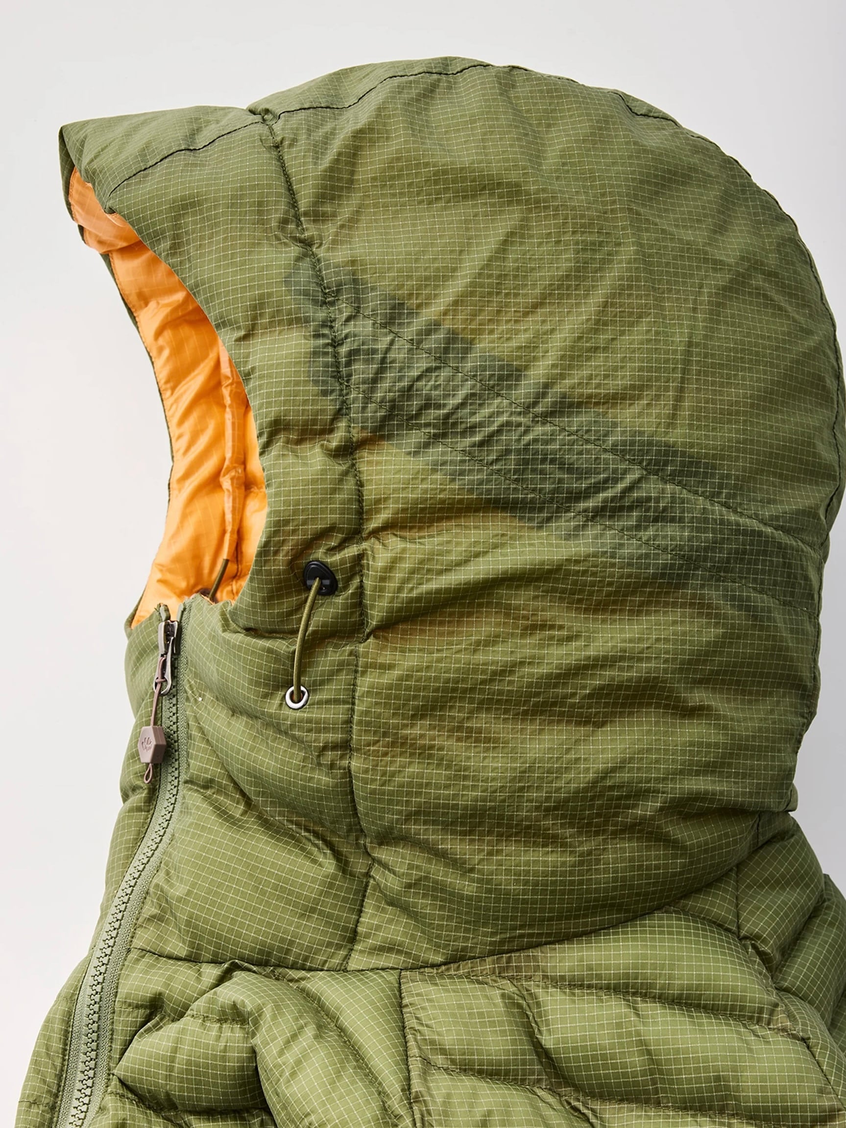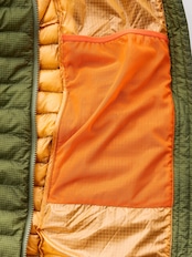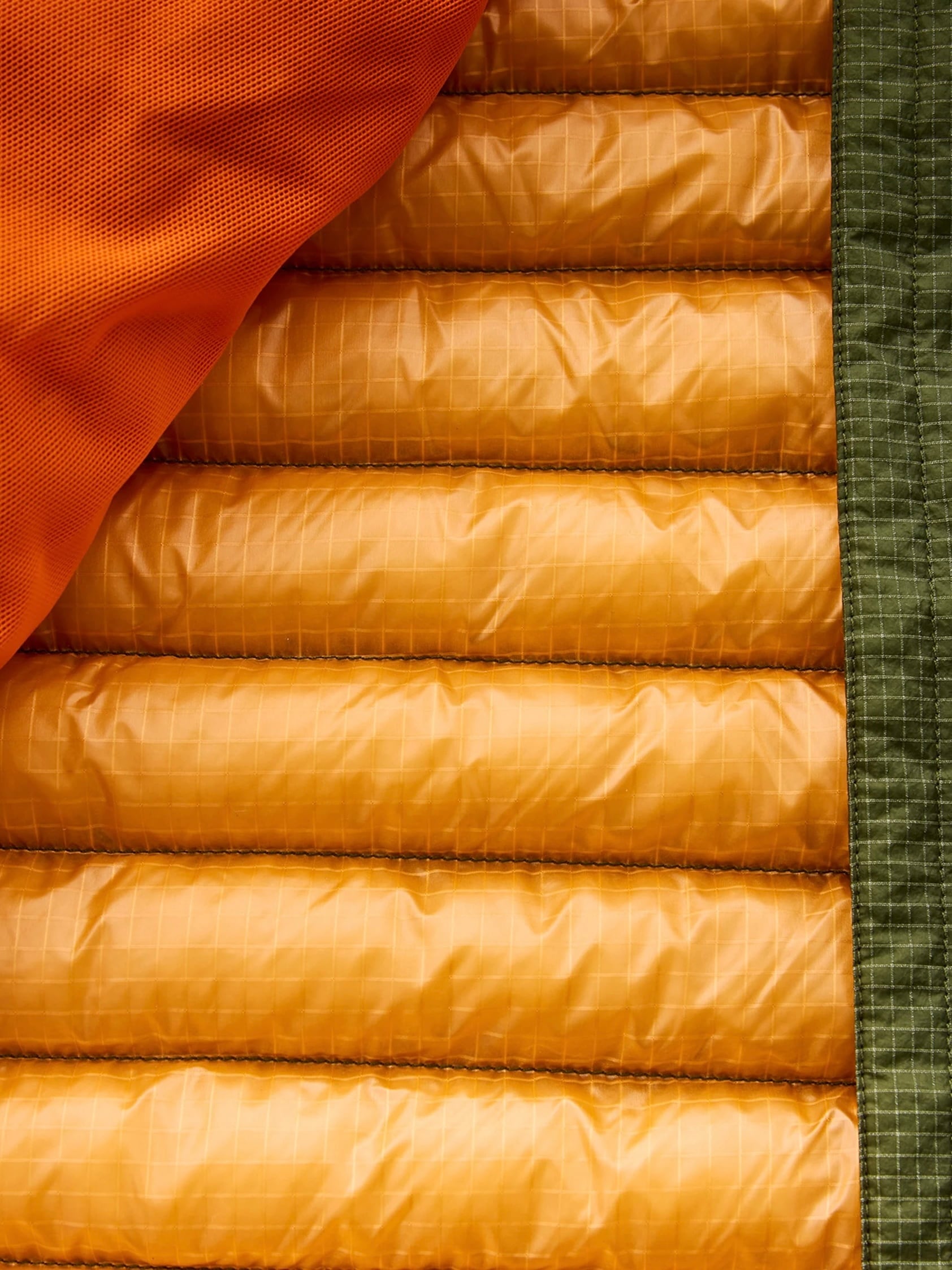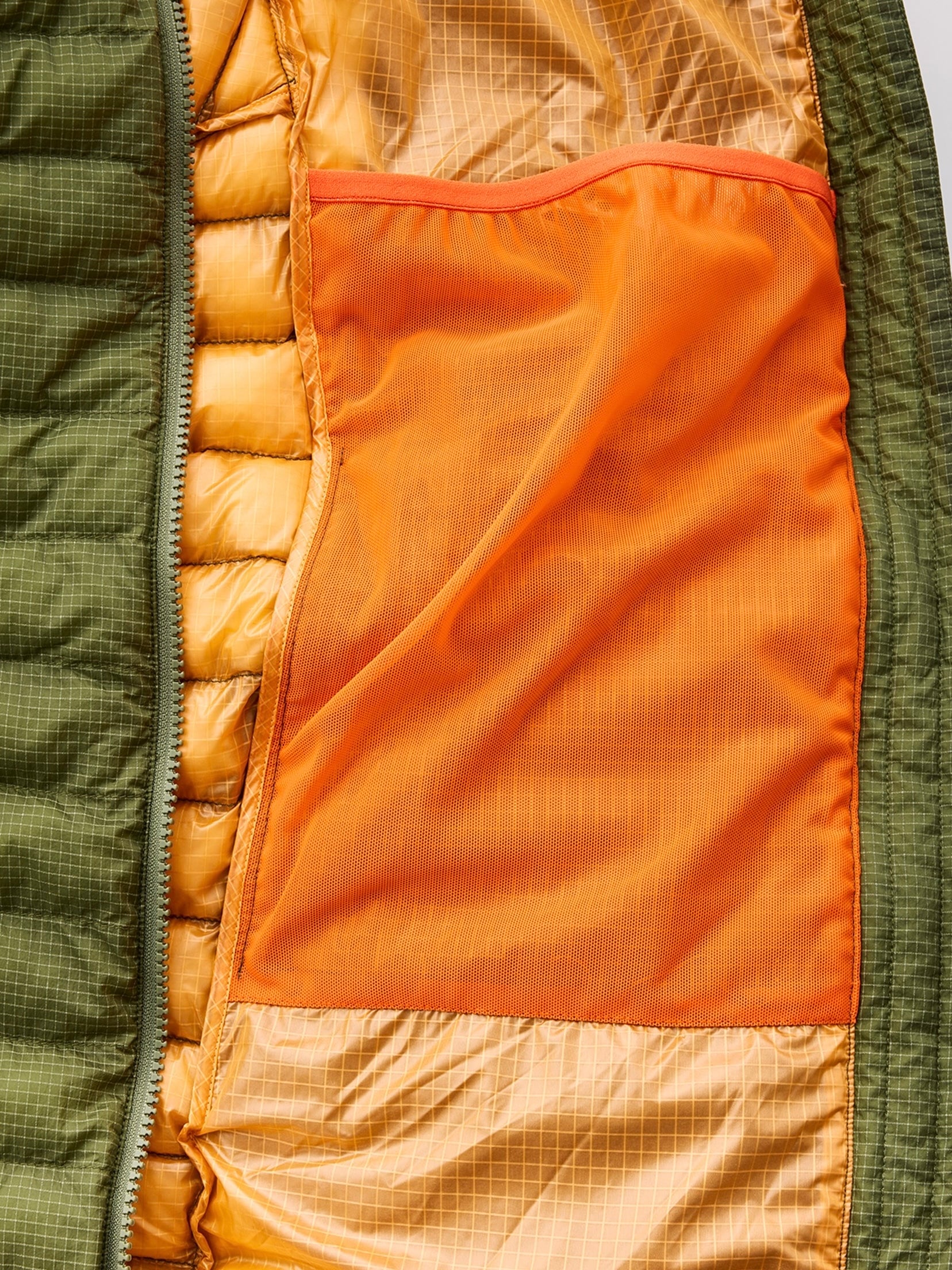 裏地は10デニールのコーデュラ。濡れたシェルの上に着ることもあるため、裏地にも撥水加工を施している。視認性の高いオレンジ色で、緊急時には裏返して目印にできる。