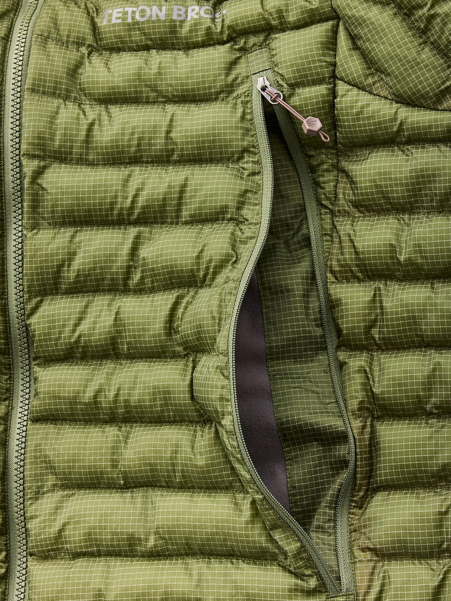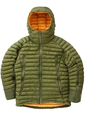 雪山での休憩や停滞時に、シェルを脱いでミッドレイヤーを着ようとすると、あっという間に体が冷やされます。では、どうするか。シェルを着たまま、その上に防寒着を重ねるのがTETON BROS.流。そんな場面を想定した化繊中綿入りのインサレーションです。シェルに重ねるためワンサイズ大きめ。袖口をジッパーで広げられるので、グローブをしたままスムーズに着用できます。中綿は、ダウンのような形状の「PrimaLoft ThermoPlume」に断熱効果の高いエアロゲルをミックス。表地はHPPE(ハイパフォーマンスポリエチレン)のリップストップで耐久性を付与。裏地は10デニールのコーデュラで、緊急時は目印になる視認性の高いオレンジ色です。濡れたシェルの上に着ることもあるため両面に撥水加工。スタッフやガイドが必ずバックパックに忍ばせる、TETON BROS.の定番です。
