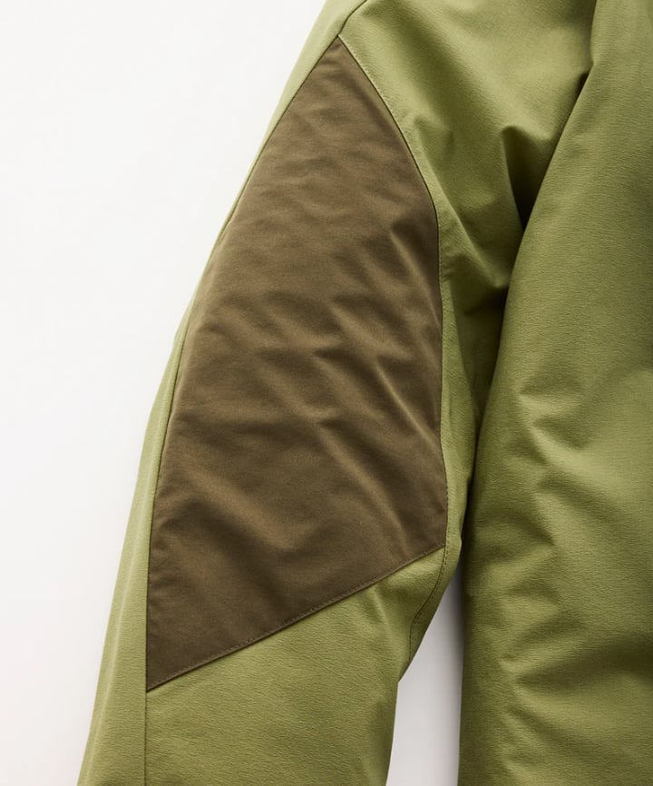 肘には摩擦から素材の損傷を防ぐエルボーパッチを配置。デザイン上のアクセントにもなっている。