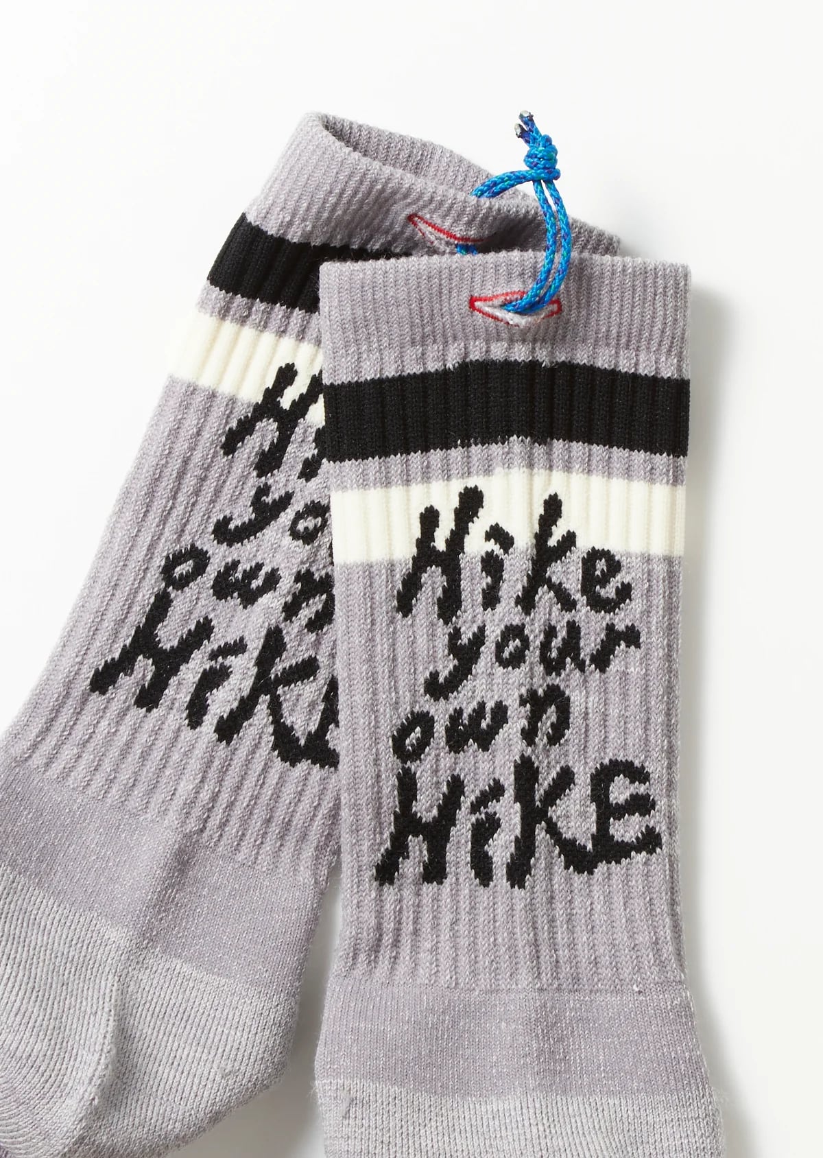 HIKER TRASHのソックスの履き口にはカラビナを通すためのホールが設けられている。これはロング・ディスタンス・ハイカーたちが濡れたソックスを乾かすためにナイフで穴をあけてテントやバックパックに吊るす様子から着想を得た。乾いたソックスはいつでもハイカーたちを幸せにする!