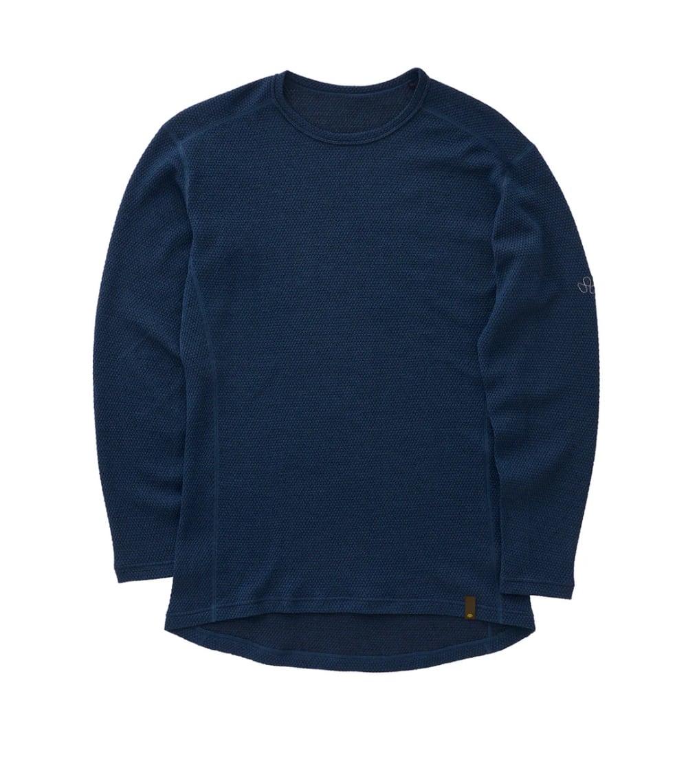 汗ポリプロピレン(PP) 疎水性アンダーは汗冷え対策の効果は絶大ですが、汗処理のために別途ウールか化繊ベースレイヤーを重ね着する必要がありました。それを1枚で解決したのが「MOB WOOL」ベースレイヤー。 メリノウール88% とPP 12% を同時に編み上げることで、肌に接するフレーム状PP 素材が水分を素早く肌から遠ざけ、ウールに拡散して乾燥を促します。柔らかく編まれたメリノウールニットがデッドエアをため込み、優れた保温性を生み出します。通気性によって換気機能は高く、シェルを脱いだ瞬間に余分な熱気や水分は放出され、肌面は常にドライに保たれます。