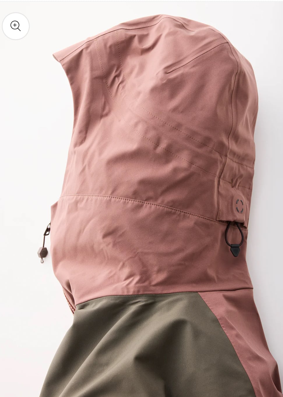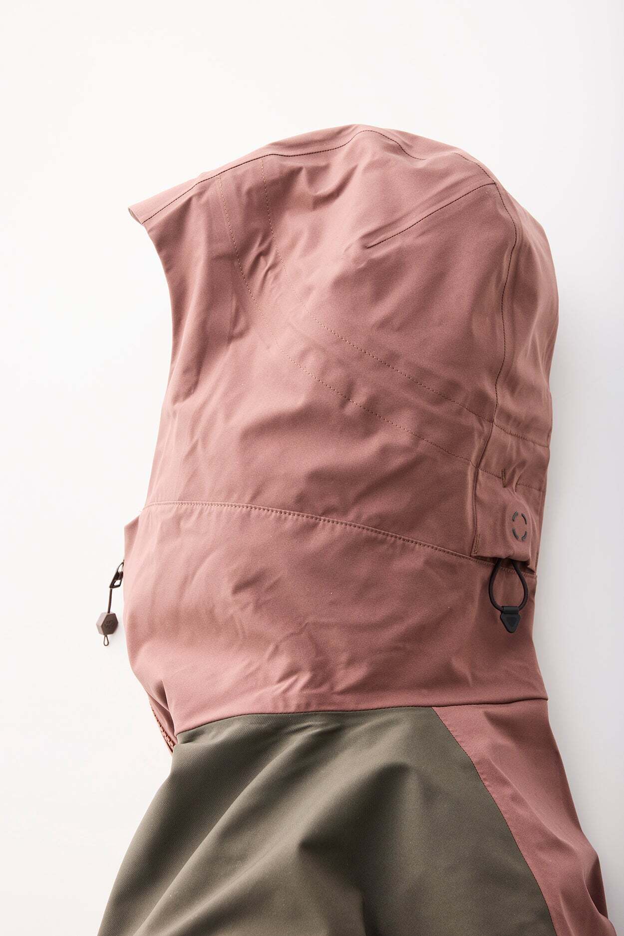 ヘルメット着用を想定したフードデザイン。後頭部のコヒーシブストッパーにより、顔部分の垂直方向と、こめかみ部分から横方向をワンアクションで調整できる。