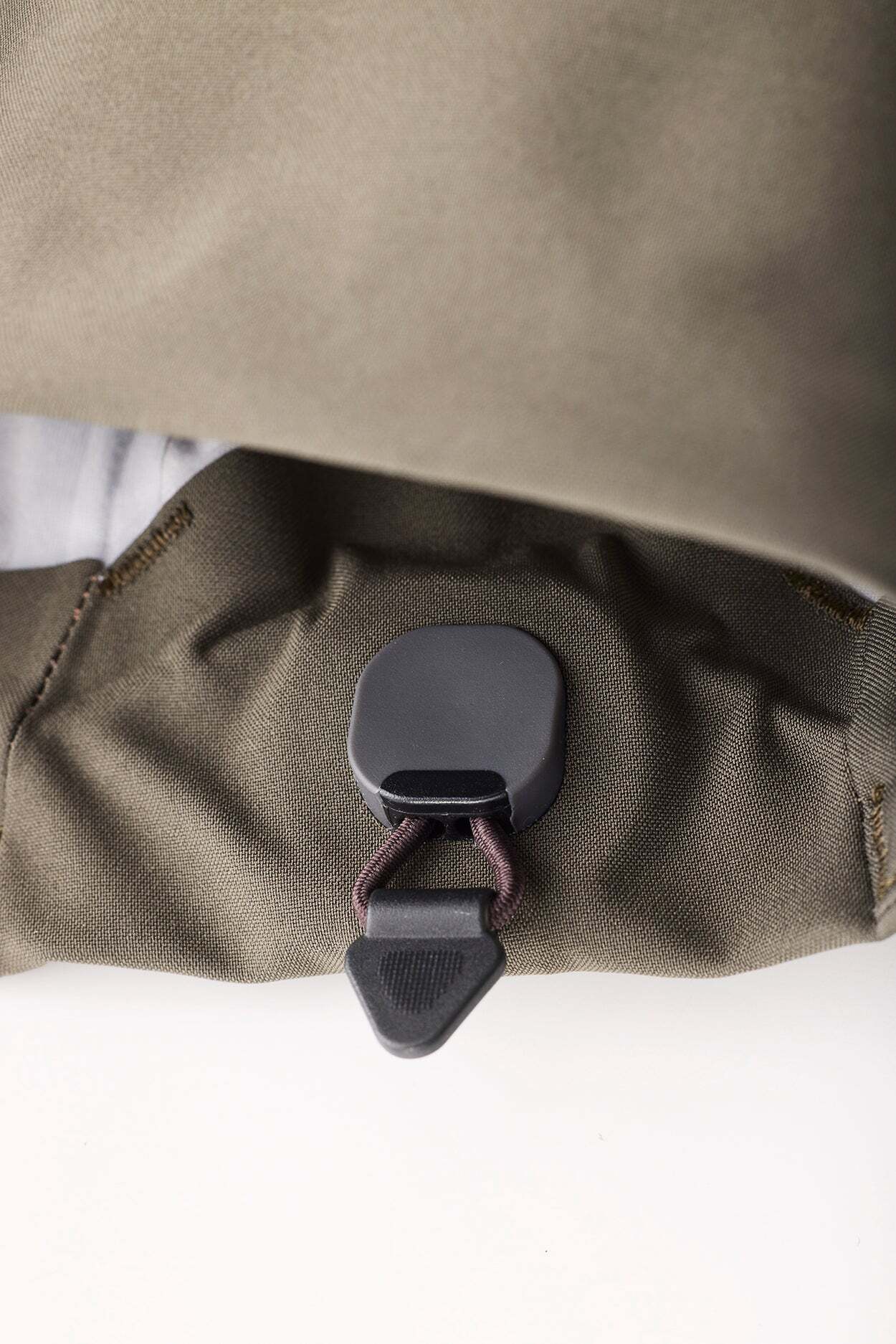裾やフードはドローコードで調整可能。コヘイシブストッパーは固定されているため、絞るときはコードを引き、リリース時はボタンを押して広げるだけとワンタッチの調整できる。