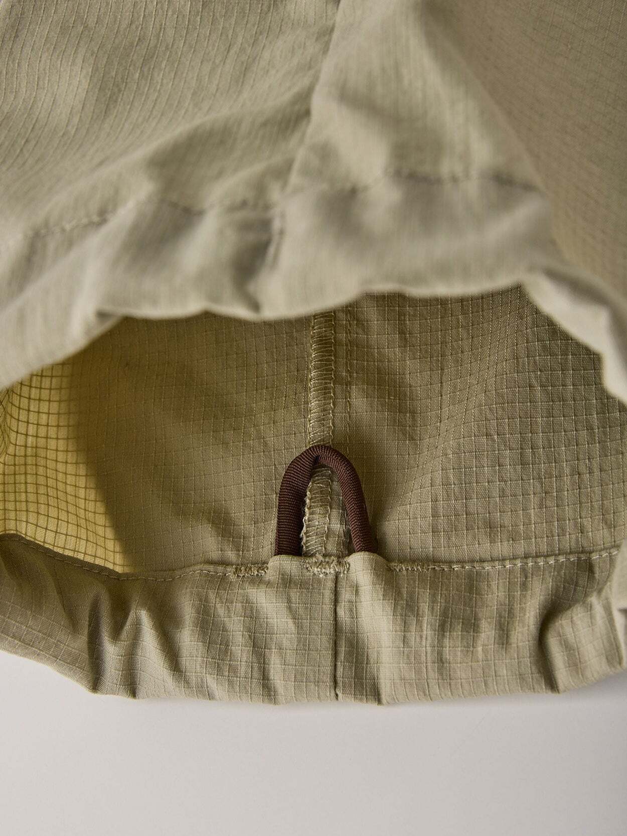 スナップボタンとジッパーの前立て。ウェストはギャザーでフィットさせ、内側のコードで微調整可能。シリコンの滑り止めで解けにくい。